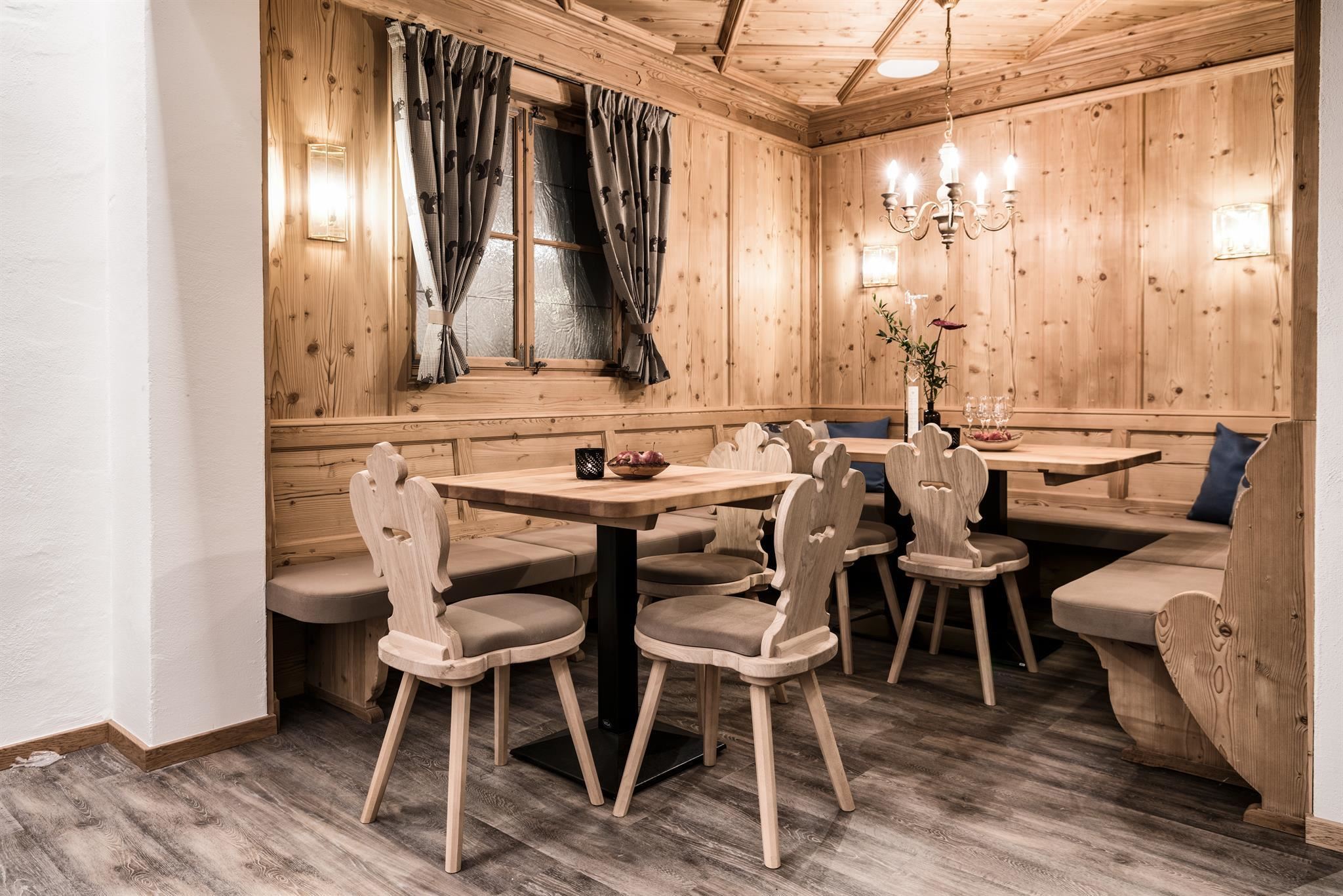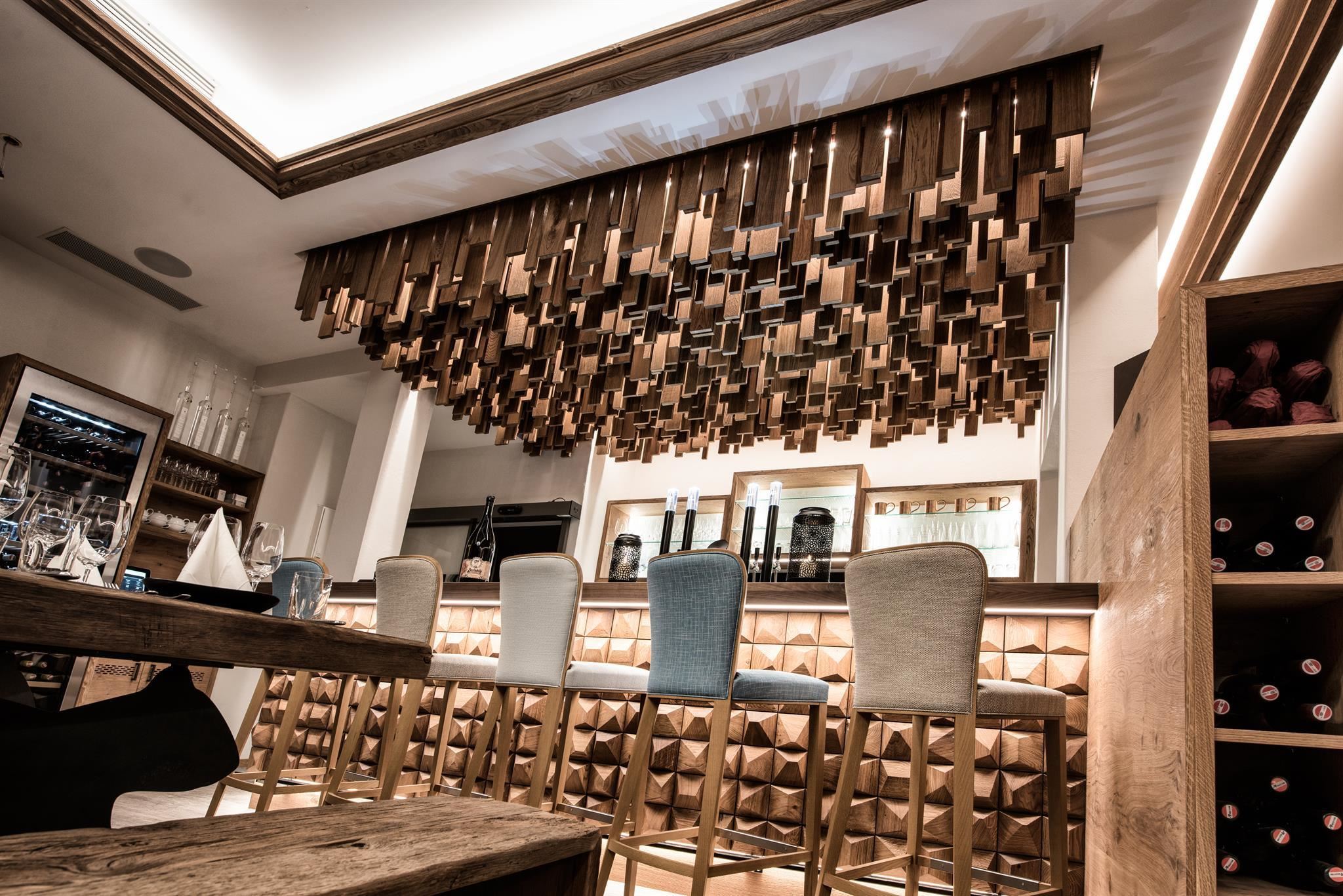 In stilvoller, detailverliebter Umgebung mit viel Holz lassen sich die Gäste an der Bar, der Lounge, am Wirtshaustisch und auf der Sonnenterrasse verwöhnen.
