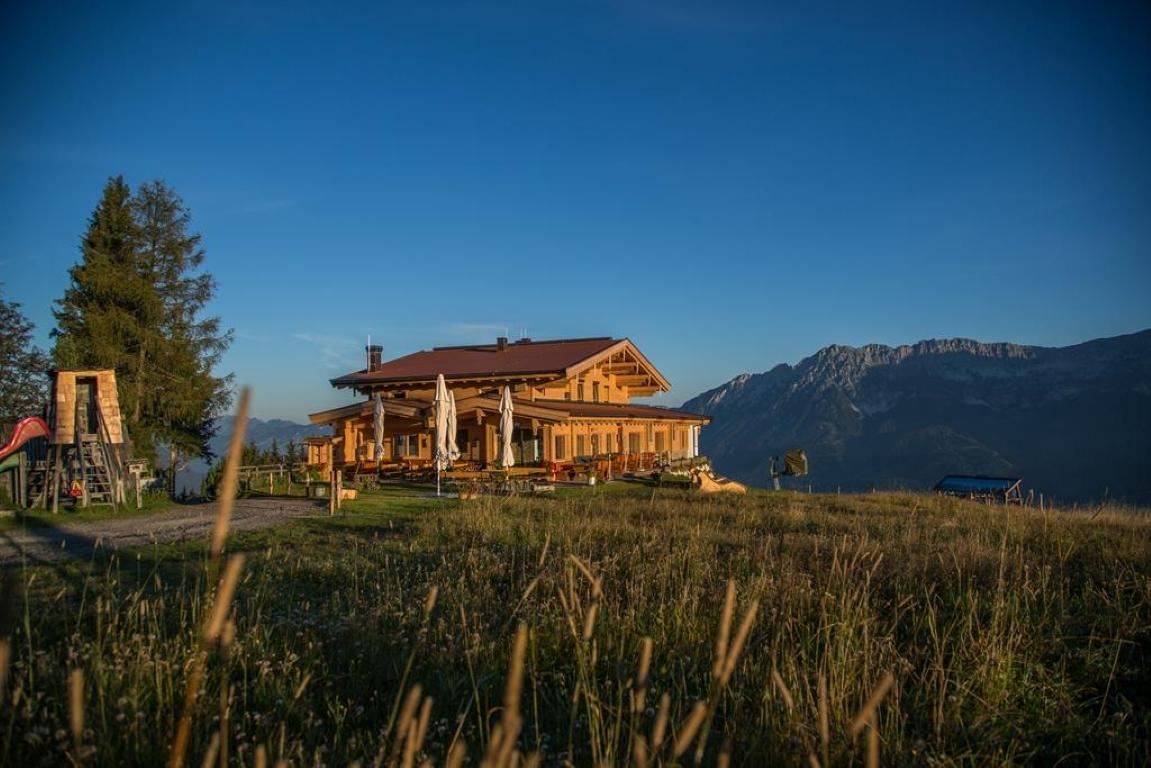 Nur 15 Gehminuten von der Bergstation der Hartkaiserbahn entfernt liegt die Jägerhütte mit herrlichem Blick auf das Kitzbühler Horn und den Wilden Kaiser.