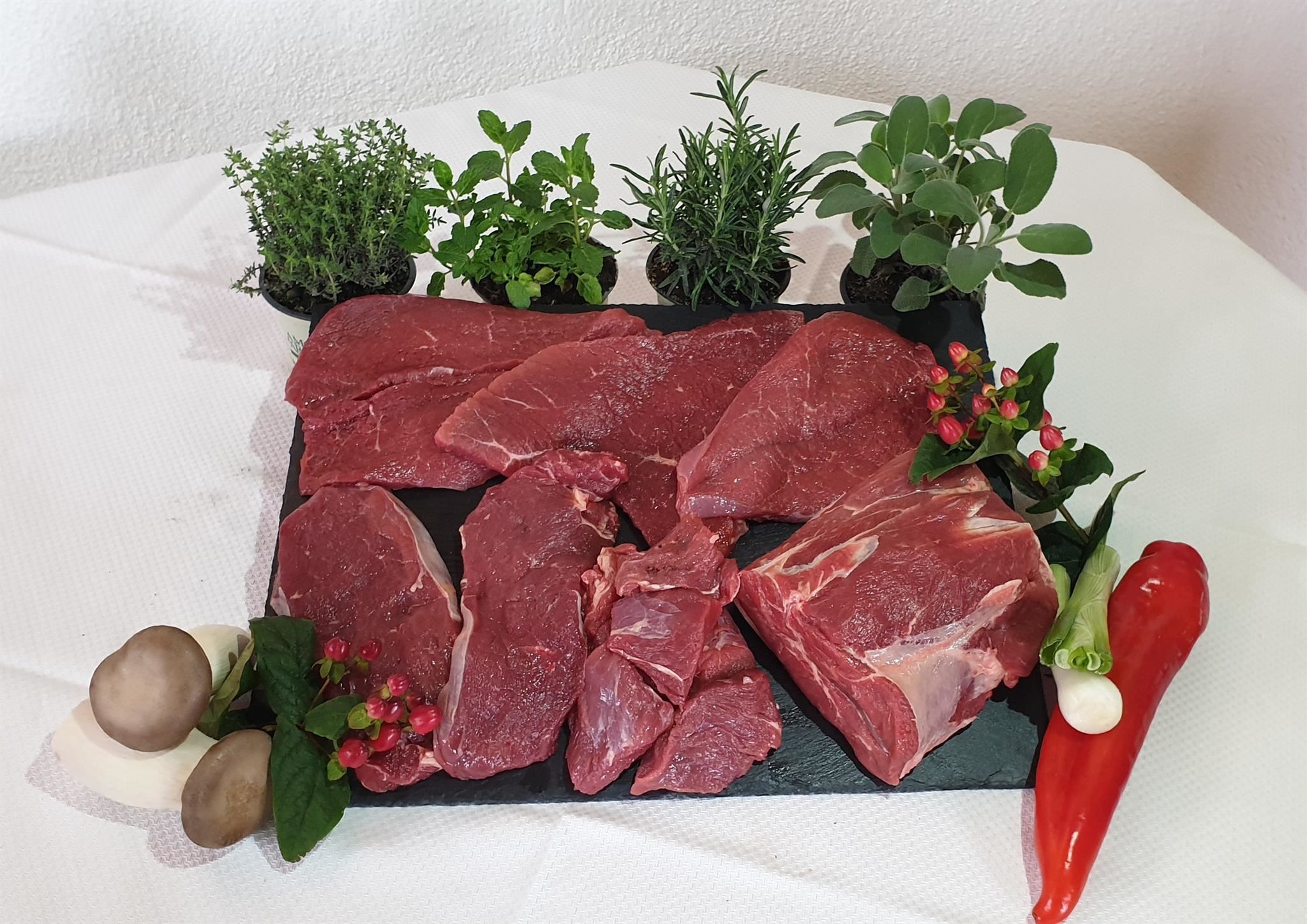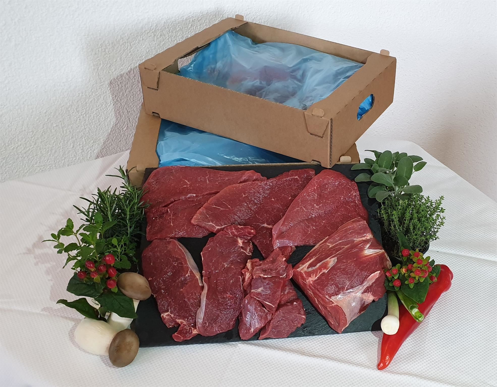 Es wird in 10 kg, bzw. in 5 kg Mischpaketen (Faschiertes, Gulaschfleisch, Schnitzelfleisch, Beinfleisch, Tafelspitz..) fix und fertig abgepackt. Suppenknochen gibt es extra auf Wusch dazu.